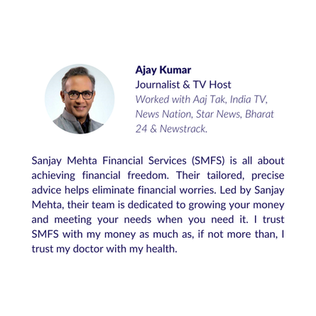 With over three decades of experience in customer service, Sanjay Mehta has established a legacy of excellence in customer satisfaction and a deep understanding of client needs and expectations in today’s business environment. Sanjay has been featured as a financial expert on live television on The Money Show on ET Now and on Radio One 94.3 FM. He has also been honored with a leadership award by BSE Star MF. In addition to his media presence, Sanjay regularly contributes financial advice columns and articles on personal finance for Hindustan Times, Mint, and Times of India.